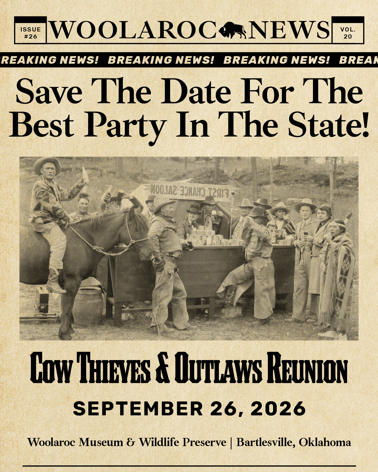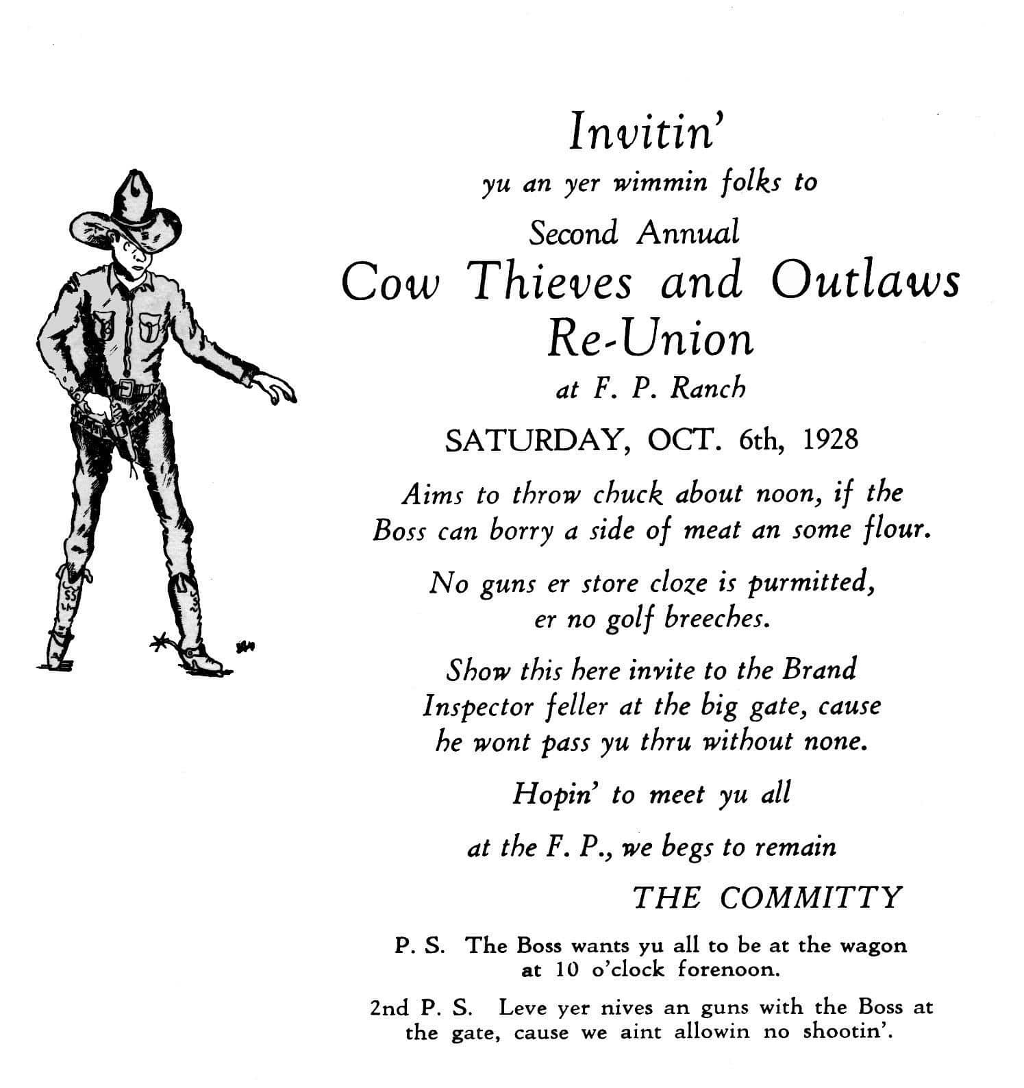 What began as a party in 1927, when Bartlesville oilman Frank Phillips played host to cowboys, socialites, thieves, bankers, and lawmen at his country estate, is now an annual tradition that preserves the history and heritage of the American West. This is the major fundraising event benefiting the Frank Phillips Foundation, the nonprofit that owns and operates the 3700-acre wildlife preserve, museum, and ranch.